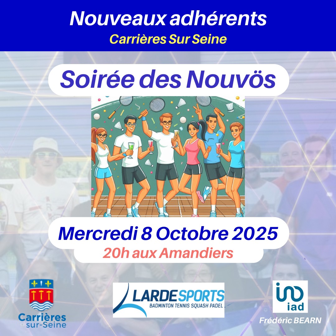 La section Badminton de Carrières-sur-Seine organise une soirée conviviale et dédiée à tous les nouveaux adhérents (Jeunes, Loisirs, Evolutifs, …) : il s’agit de la Soirée des Nouvos 2025 ! 🥳